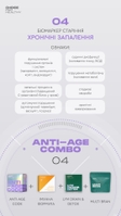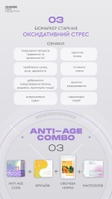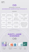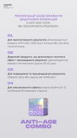 ПРИЗНАЧЕННЯ: Anti-Age Code рекомендується для осіб, які прагнуть уповільнити процеси старіння та зберегти молодість і енергію. Цей інноваційний комплекс підходить для поліпшення когнітивних функцій, підвищення розумової та фізичної витривалості, підтримки еластичності кровоносних судин. Комплекс особливо корисний для тих, хто хоче запобігти оксидативному стресу, зменшити ознаки біологічного старіння. Anti-Age Code також рекомендується вживати для збільшення вироблення енергії, поліпшення обміну речовин і відновлення м`язової сили.